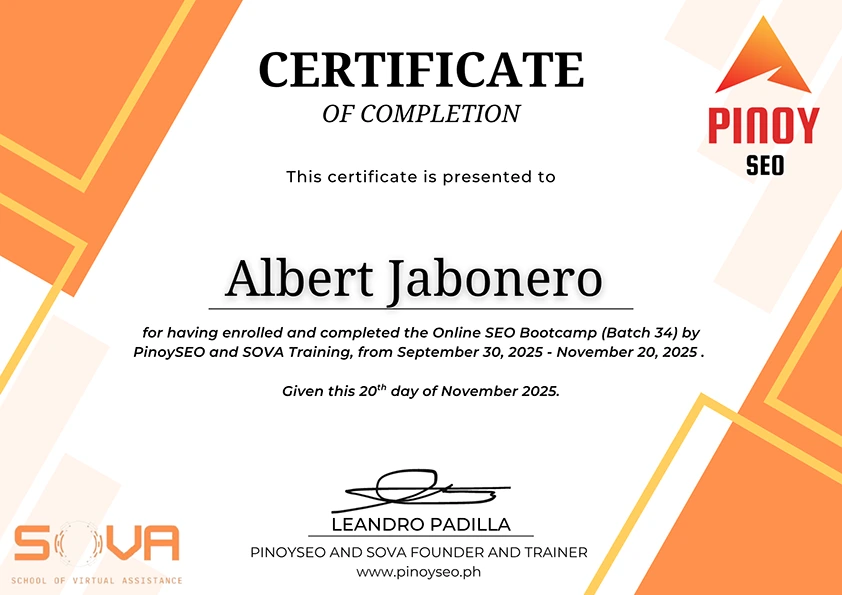 I completed the PinoySEO Bootcamp, one of the most respected SEO training programs in the Philippines. This bootcamp gave me hands-on experience in real SEO projects—covering technical SEO, keyword research, on-page optimization, content strategy, link building, and analytics.